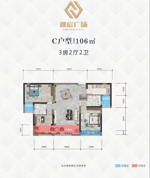 C户型,建面约106平米三室两厅两卫,该户型南向三开间,4.2米大开间与餐厅一体化设计。